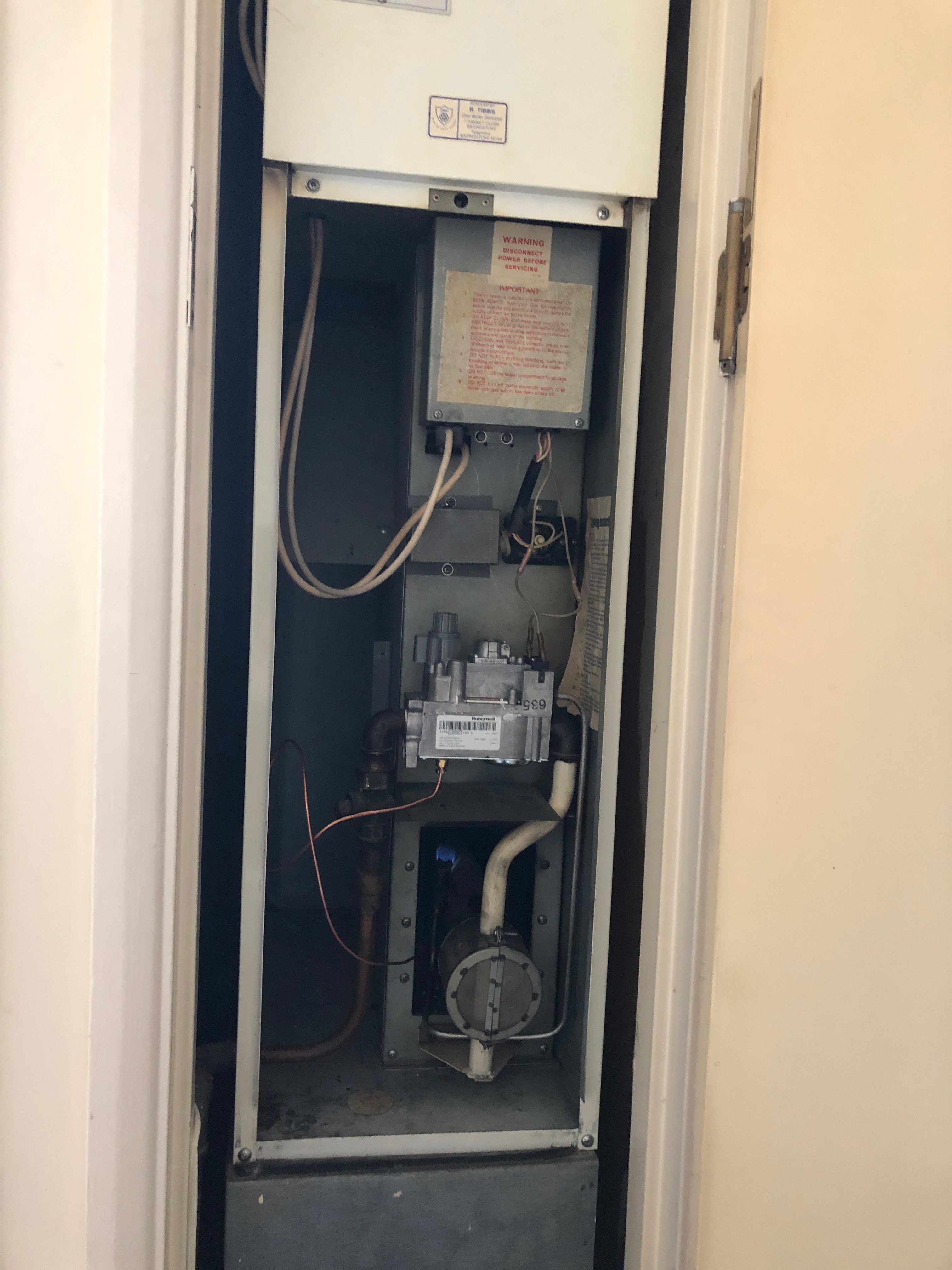 It is an open-flue, down-flow warm air heater with a pressed steel heat exchanger, ‘hamster-wheel’ format air circulation fan and interestingly, a cast iron gas burner bar.