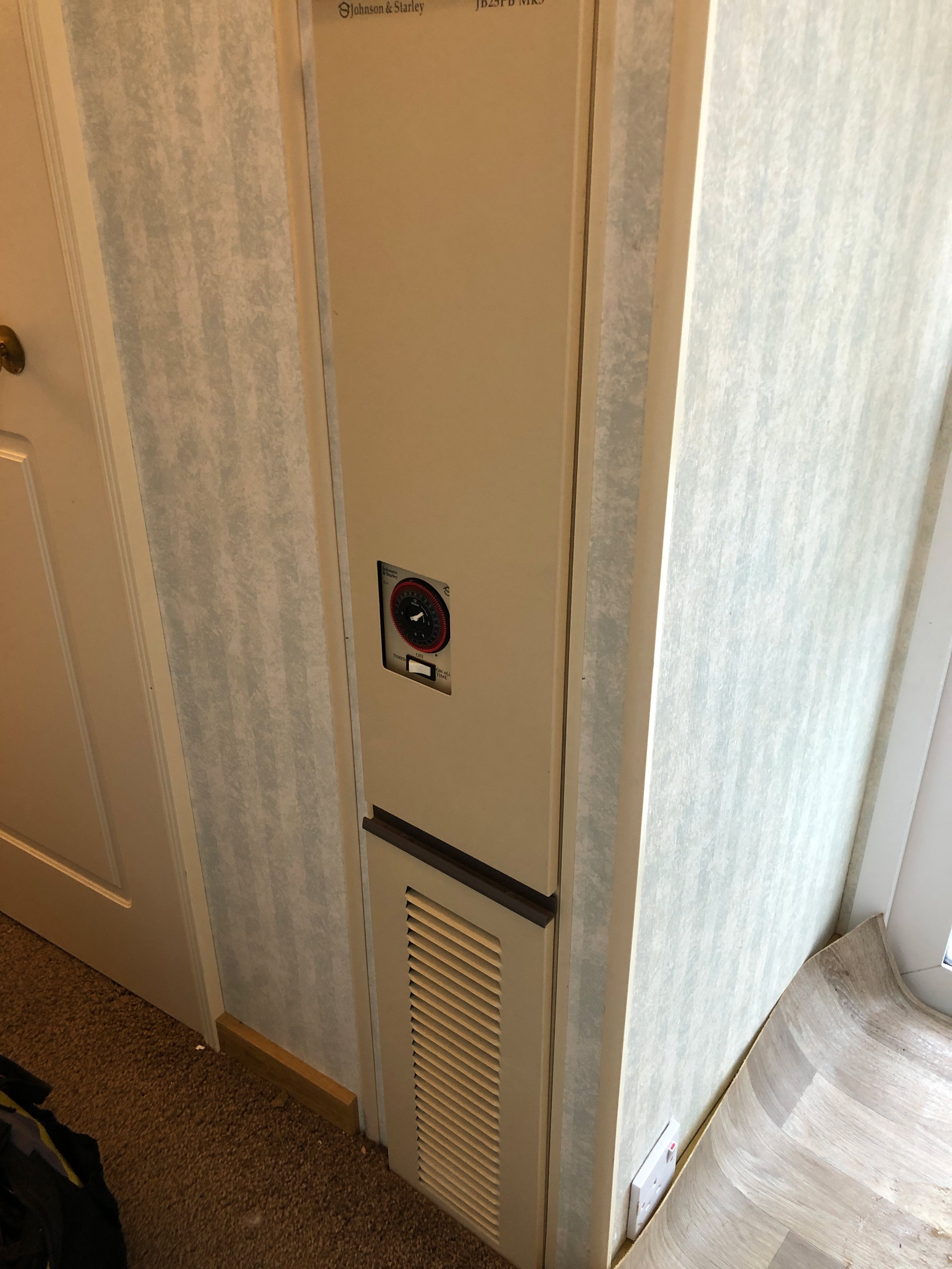 The JB25PB is a tall, slim warm air heater designed specifically for installation in mobile homes. Although about 5ft tall it is about sevn inches wide so strikingly compact for the limited space available and comes with a 24Vac electronic room thermostat. Being for mobile homes it runs on LPG and I suspect the “PB” in the model number indicates “propane and Butane”.