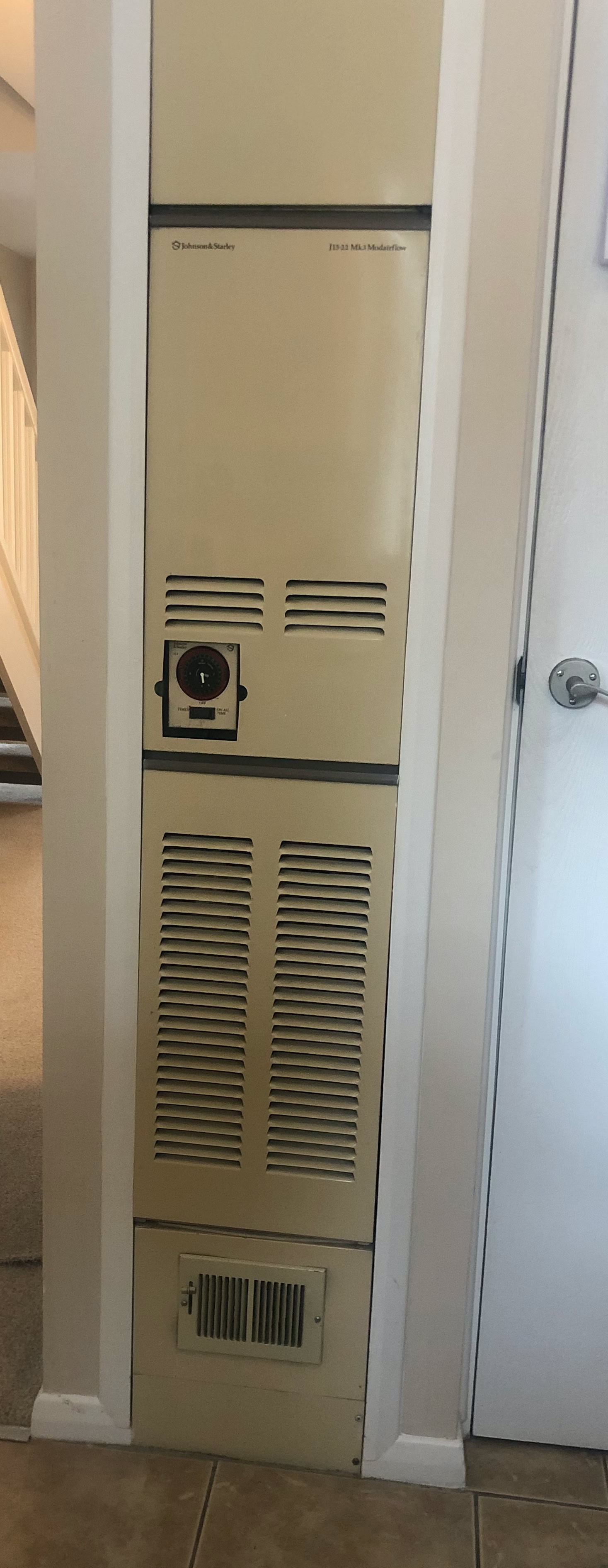 The Modairflow version is structurally the same as the basic J25-32 but has electronic temperature control. The electronic room thermostat (called a “Thermista-Stat”) measures room temperature and communicating with the electronic panel inside the J25-32 Modairflow, speeds up the air circulation fan or slows it down according to how close the room temperature is to the room temperature selected by the user on the room Thermista-Stat. This proportional control system is more comfortable to live with as the inherent rise and fall in room temperature associated with the basic room thermostat turning on and off in cycles no longer occurs.