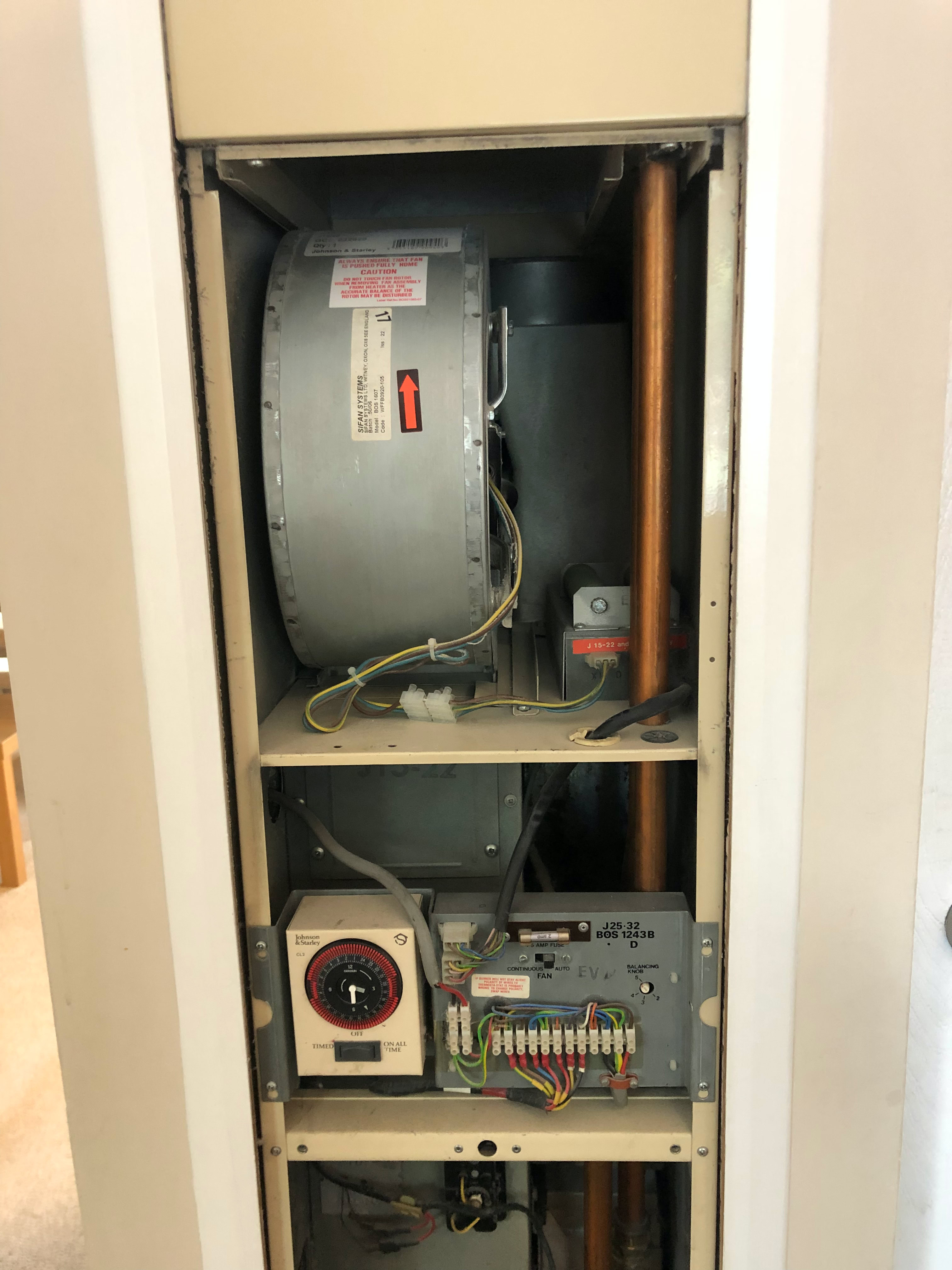 The J25-32 warm air heater was introduced long ago in the 1960s I think, then updated with Mk2 and then Mk3 versions in the 70s then 80s. This was probably the most successful of all the warm air heaters in the early days of central heating and many, many examples of the Mk3 version are still in use. As far as I know, all of the commonly failing parts in the Mk3 are still freely available so any breakdowns can usually be fixed. The original and Mk2 versions are much rarer and no longer fully supported with spares.
