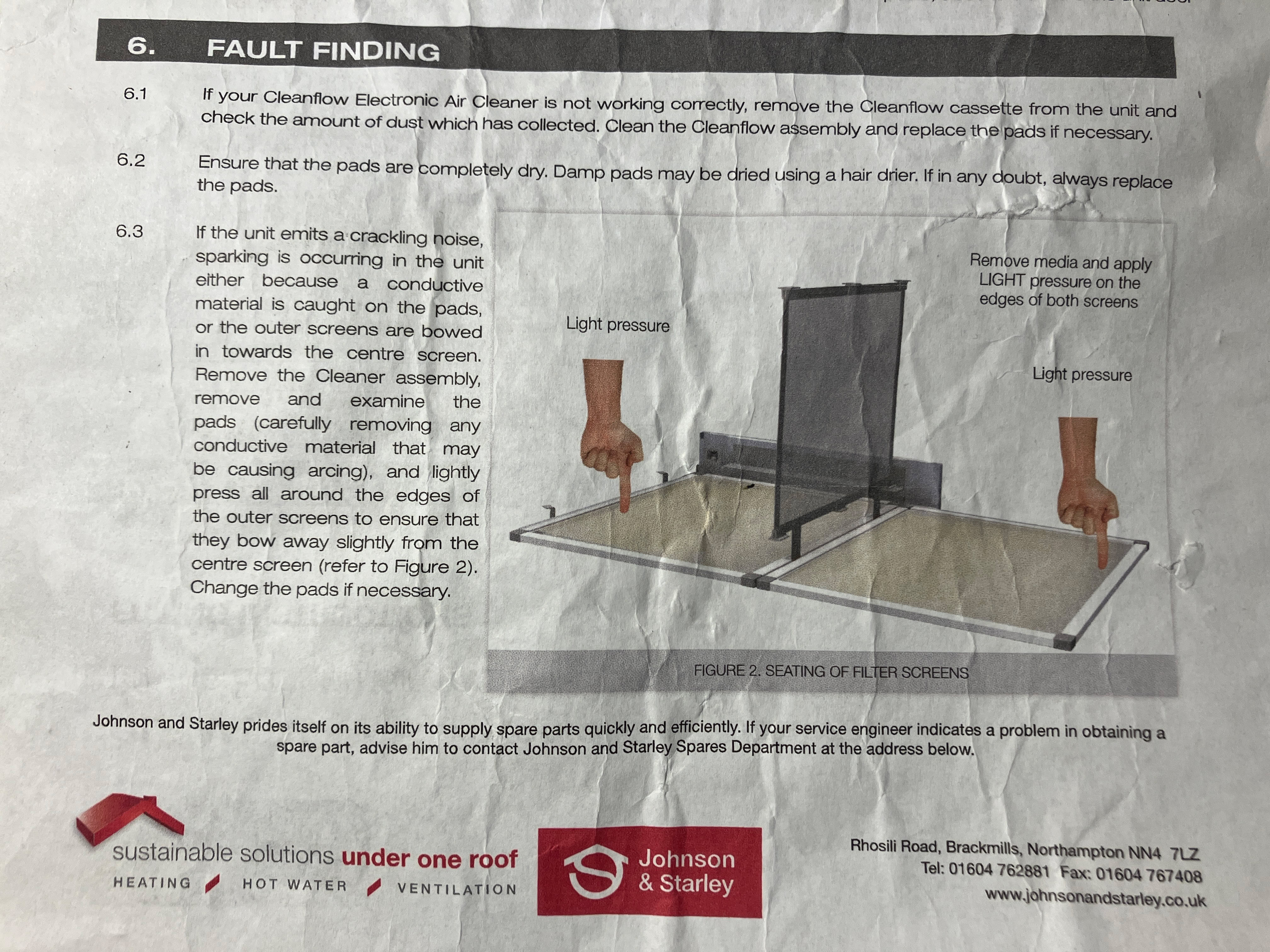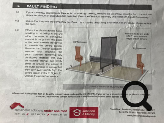 Photo showing the ‘fault’ section of the instruction sheet that comes with the electronic filter medium pack