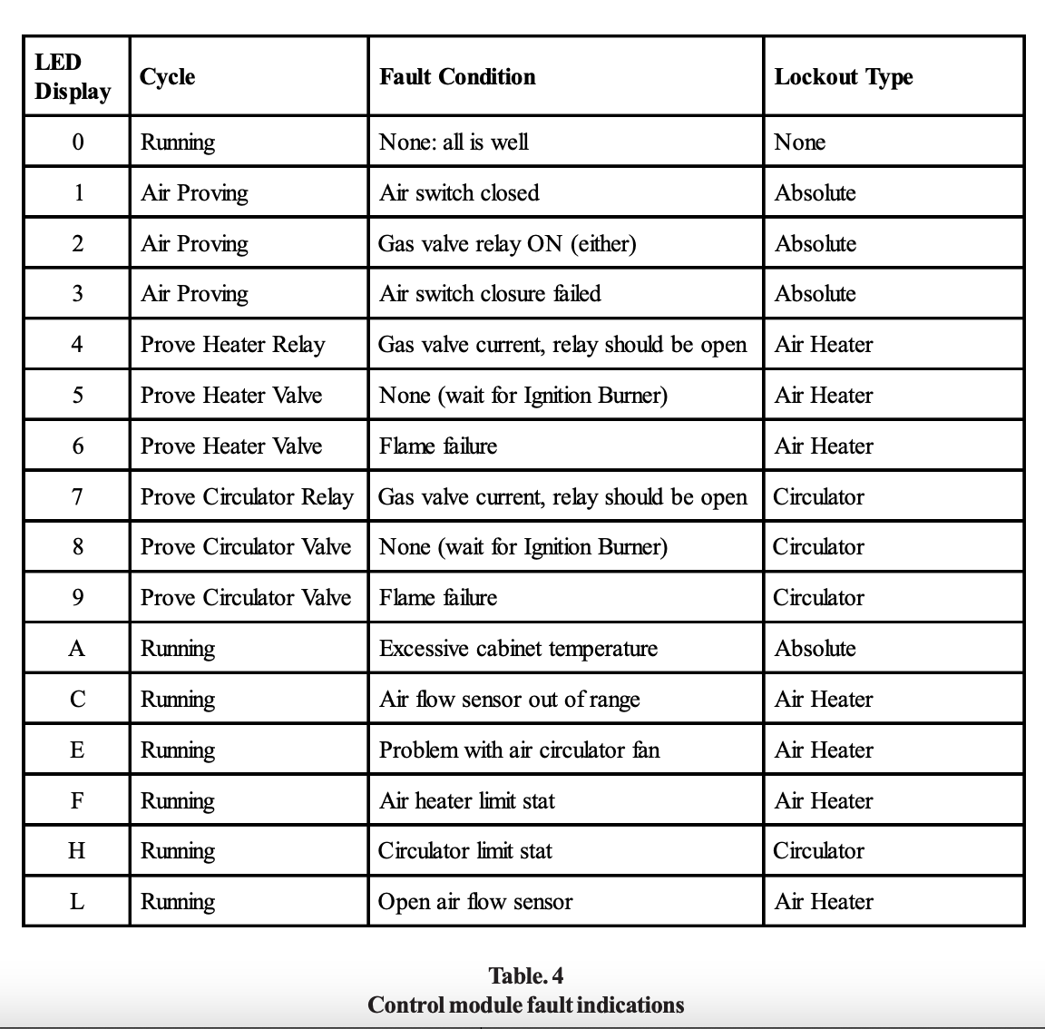 Lots more error codes are printed on the cover plate on the control board (as in this photo) and more details can be looked up in the boiler manual, but none can be fixed by the layman. A warm air technician will need to be called out. Here is a screenshot of the chart in the manual giving more information. (Hopefully J&S won’t mind me reproducing it here.)