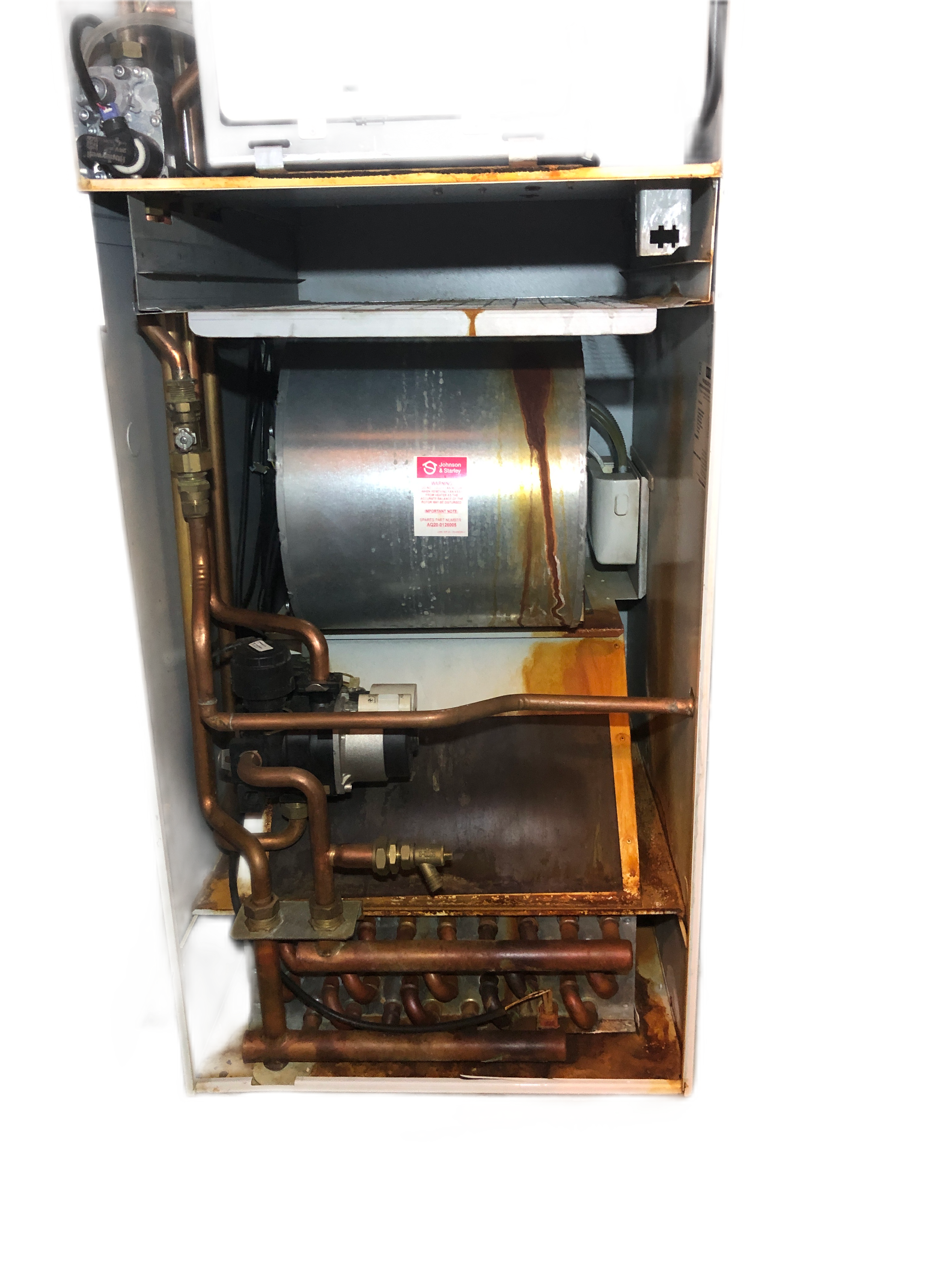 All the post-2015 Johnson and Starley gas-fired warm air heaters seem to suffer from condensate leaks. A shame as the leaking water is corrosive and can damage a variety of parts (often electrical) if the leak is making them wet. Condensate leaks can be from a variety of places in the boiler, or can also originate inside a badly installed flue system. EDIT to add: This problem is developing into a more specific leak on the DW series heat exchanger. I’ve now seen two DW boilers where the main heat exchanger itself is leaking condensate and on one, products of combustion (POCs) were leaking too. POCs leaking is dangerous and means the boiler must not be used. The solution is to fit a new heat exchanger.